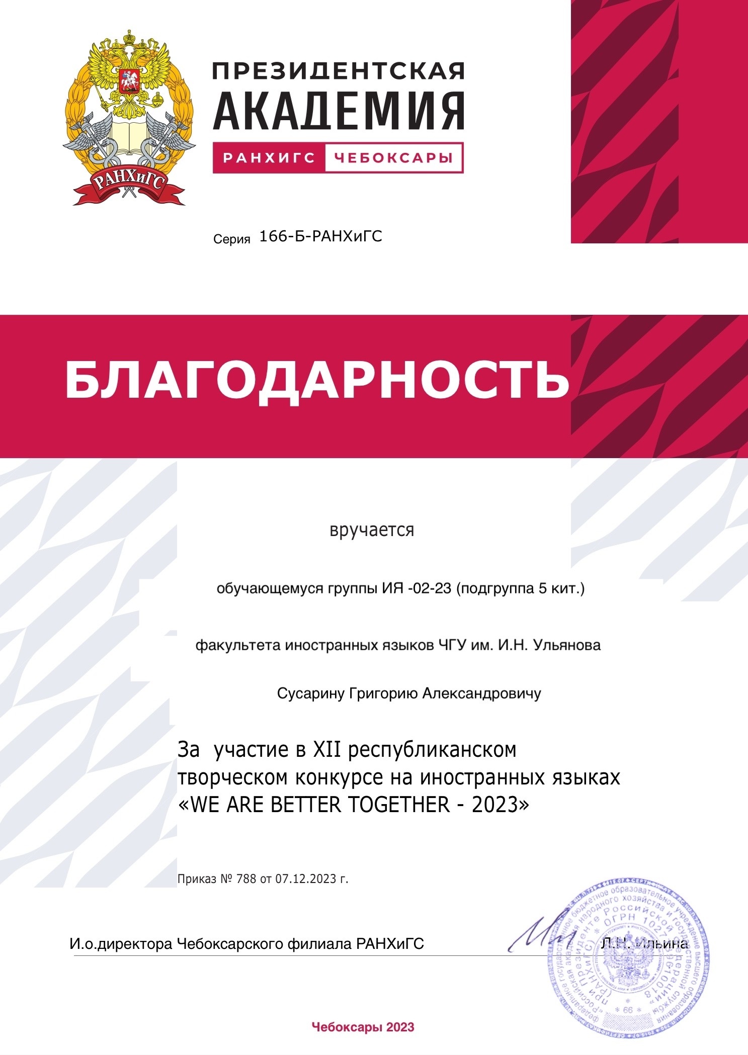 Совсем недавно в Чебоксарском филиале РАНХиГС состоялся финал XII республиканского творческого конкурса на иностранных языках Чебоксарского филиала РАНХиГС «WE ARE BETTER TOGETHER – 2023»🪄