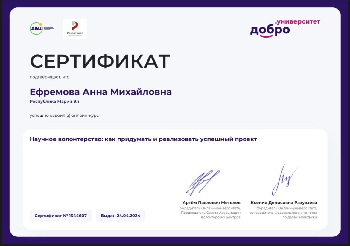 • Вы познакомитесь с понятием «научное волонтёрство»; • узнаете, что именно делают научные волонтёры поймете, как деятельность научных волонтёров может помочь исследователям; • познакомитесь с существующими инициативами в сфере научного волонтёрства; • узнаете, как из каких этапов состоит процесс создания проекта в сфере научного волонтёрства; • узнаете типичные ошибки, которые совершают авторы проектов в сфере научного волонтёрства. Если ты заинтересован в волонтерстве и курс показался тебе полезным, то по этой ссылке можно ознакомиться с подробной информацией и получить новые знания для реализации своего проекта