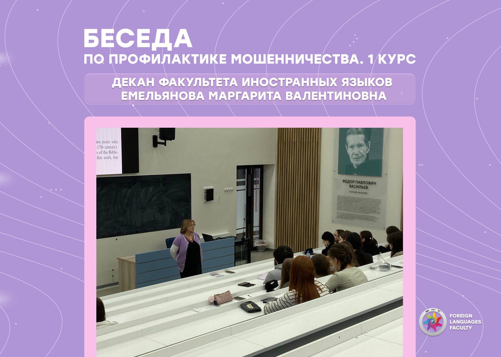 13 февраля декан факультета иностранных языков Емельянова Маргарита Валентиновна выступила перед студентами 1 курса с беседой о профилактике мошенничества.