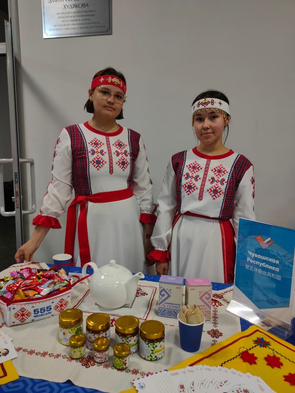 Гостей форума угостили традиционными чувашскими чаями "Нарспи" и "Сетнер", конфетами компании "Акконд" и чувашским мёдом: лесным, луговым, липовым, донниковым, яблочным, гречишный, с пыльцой.