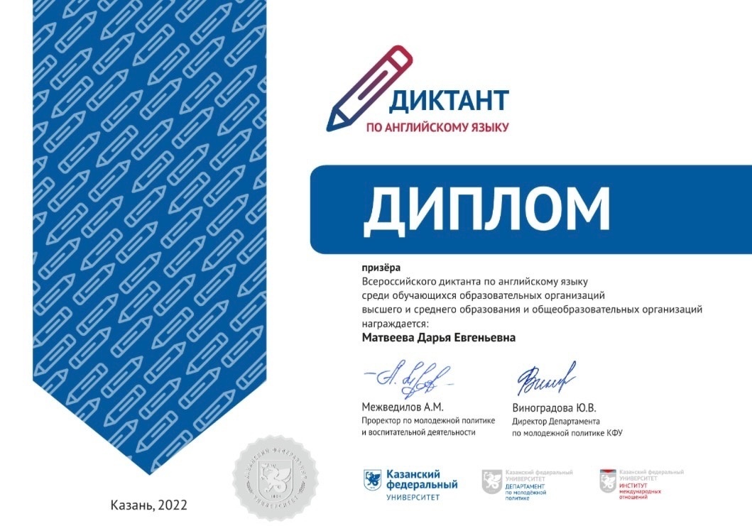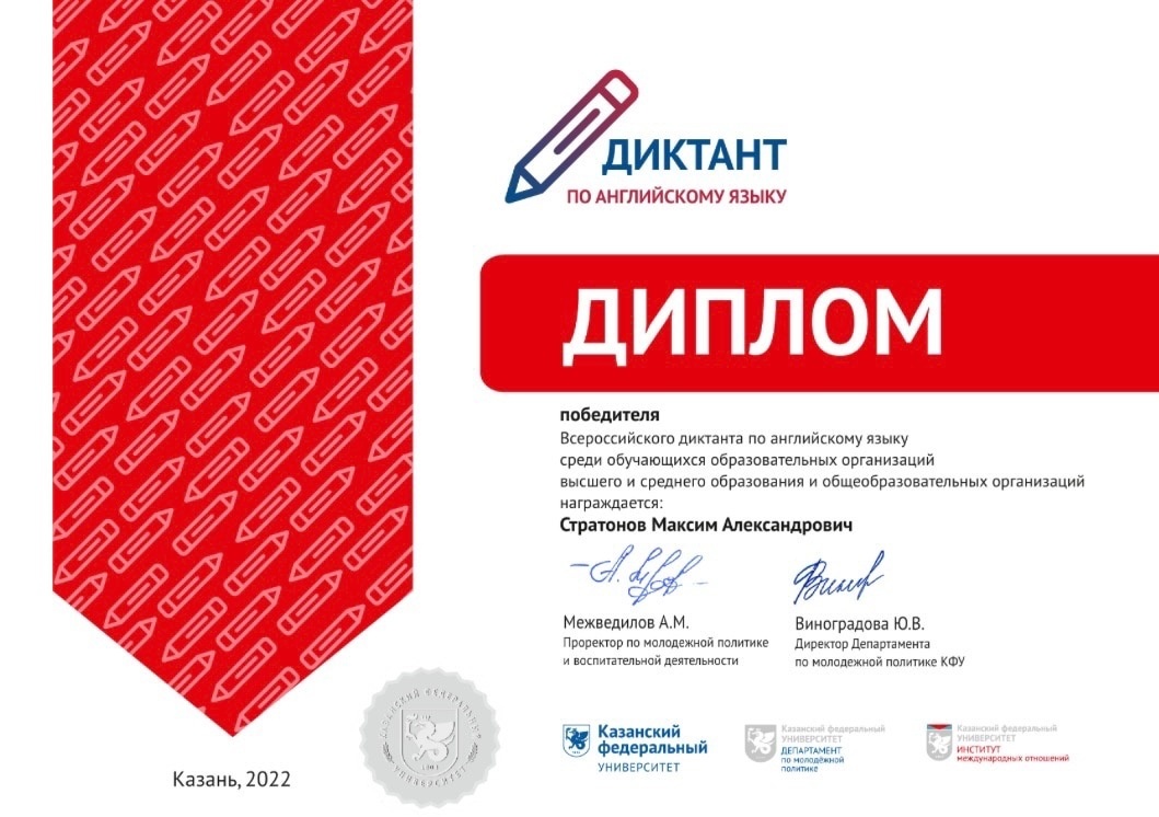 Поздравляем победителя Диктанта Стратонова Максима и призера Матвееву Дарью!